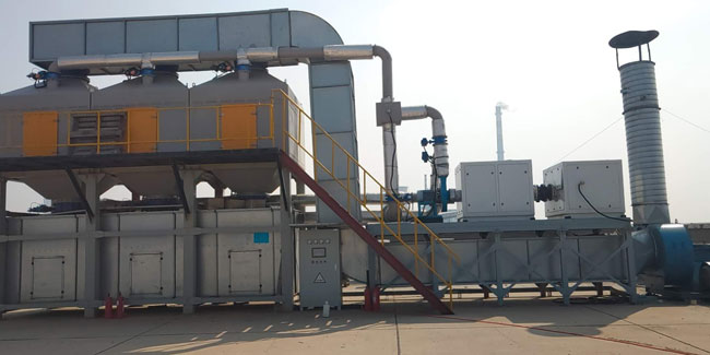 該催化燃燒處理設(shè)備主要用于噴漆房、有毒塑料、化學(xué)品生產(chǎn)線的有機(jī)廢氣的處理;是在原有的噴淋除霧設(shè)施的基礎(chǔ)上,增加過濾器和活性炭吸附塔,并用特有的催化劑再高溫狀態(tài)下將活性炭的RTO、RCO脫除,使活性炭吸附塔具有再生功能,極大的降低了設(shè)備的運(yùn)行成本和改造成本。如下圖: